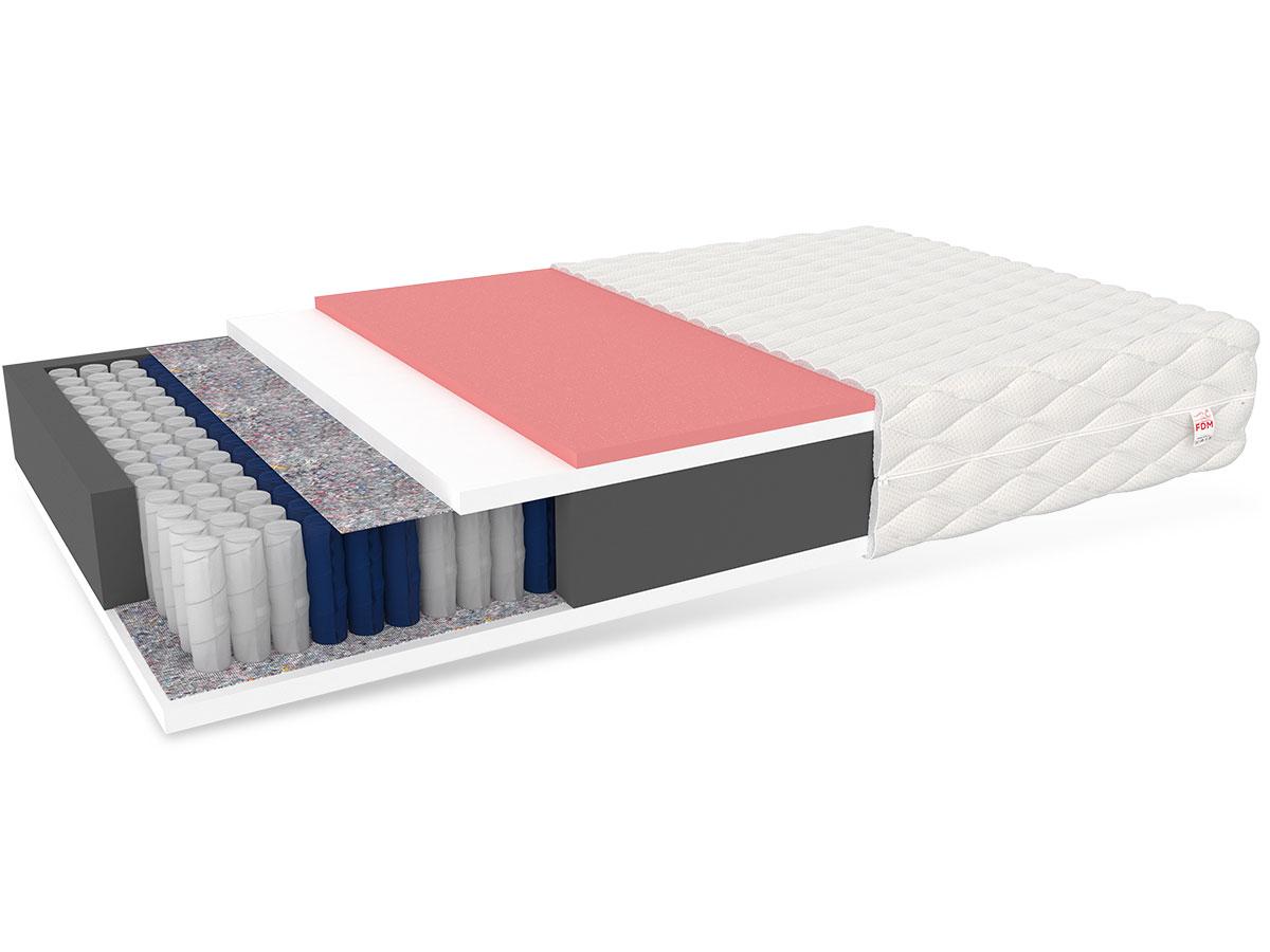 Bazę materaca VERO MAX stanowi formatka pocketowa (kieszonkowa). Sprężyny pocketowe zostały wykonane w technologii NanoHARD, podwójnie hartowany drut znacznie przedłuża ich żywotność. Dzięki zastosowaniu 7-stref o zróżnicowanej twardości materac zapewnia ergonomiczną pozycję ciała podczas wypoczynku. Niezależna praca sprężyn, eliminuje efekt wyginania się dużej powierzchni materaca przy nacisku na jego małą powierzchnię. Dzięki czemu wszelkiego rodzaju obracanie, czy wiercenie nie będzie odczuwalne dla drugiej osoby. Wkład kieszeniowy otacza pianka poliuretanowa T25, odporna na odkształcenia. Dodatkowo materac został wyposażony w warstwę pianki termoplastycznej VISCO, która idealnie dopasowuje się do kształtu sylwetki.