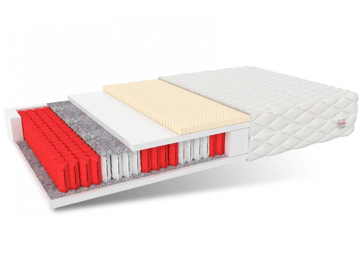 Materac RIMINI MAX posiada sprężyny kieszeniowe typu multipocket, które dzielą go na 7stref twardości. Sprężyn multipocketowych jest więcej niż w standardowych formatkach pocketowych. Pracują niezależnie od siebie, dzięki czemu dwie śpiące osoby nie odczuwają dyskomfortu z powodu wzajemnych ruchów. Charakteryzują się dużą odpornością na odkształcenia oraz wgniecenia. Zostały wykonane w technologii podwójnego hartowania NanoHARD, co znacznie zwiększa ich żywotność. Pianka poliuretanowa zapewnia amortyzację sylwetki, posiada przewiewną strukturę oraz jest odporna na odkształcenia. Warstwa lateksu zastosowana w materacu poprawia komfort spania, optymalnie dostosowując się do kształtu ciała. Specjalne kanaliki zapewniają odpowiednią cyrkulację powietrza, co daje uczucie delikatnego chłodu.